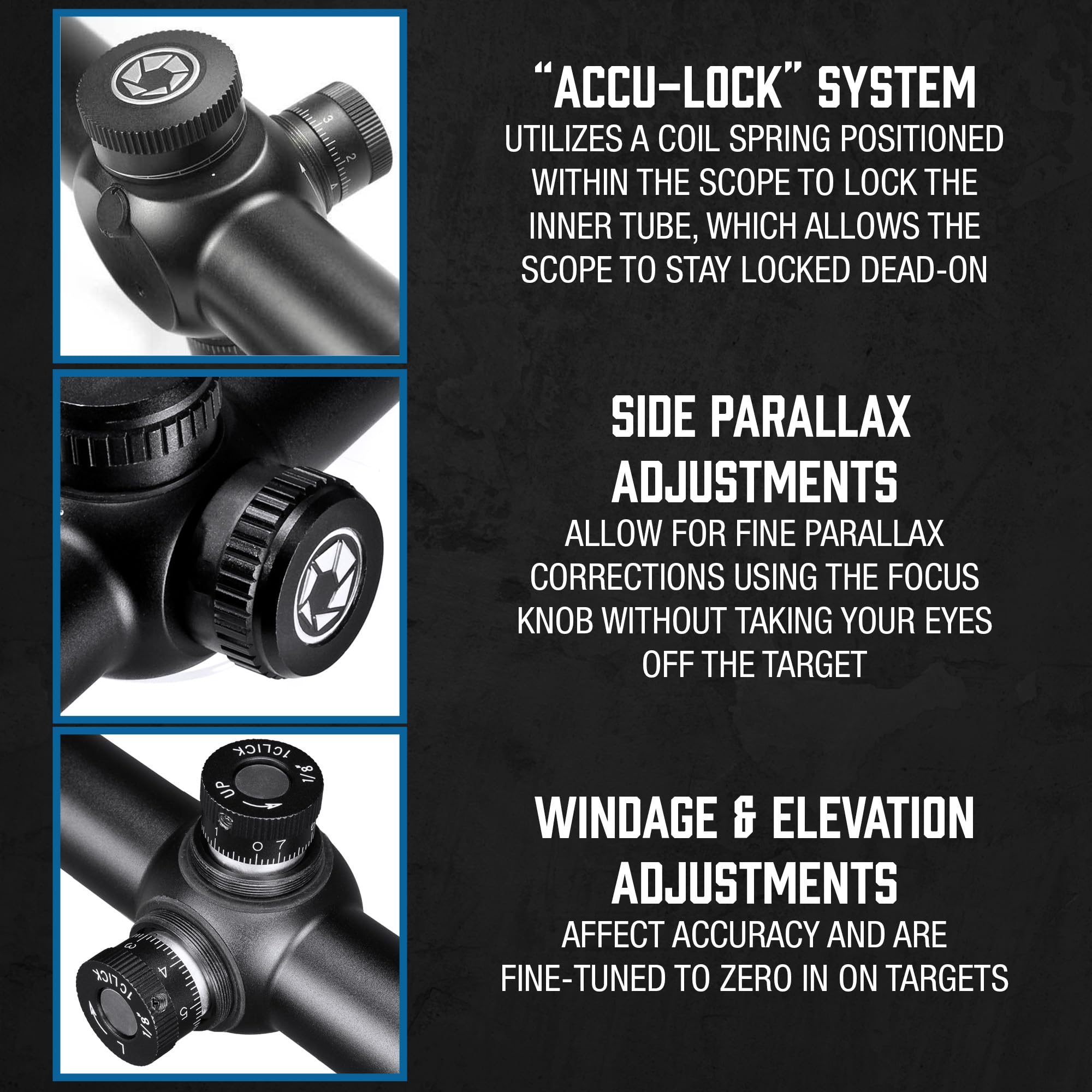 - ACCU-LOCK: The scope features a coil spring positioning system to securely lock the inner tube, allowing the scope to stay locked dead-on after firing.